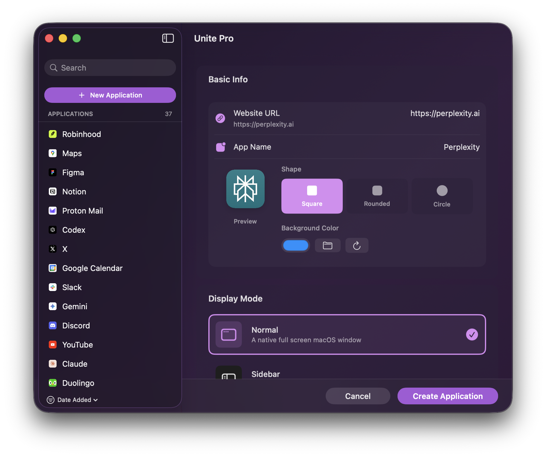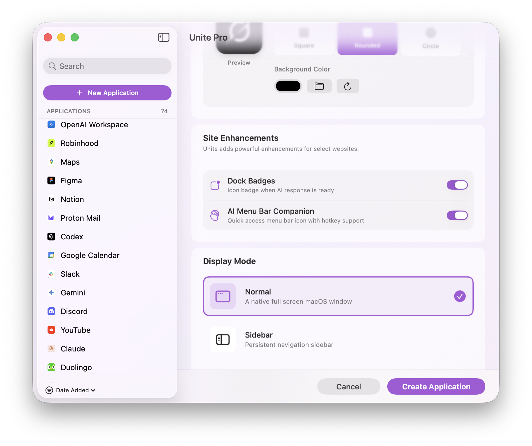 Your new app now appears in the Unite Pro sidebar and in your Applications folder. You can launch it from there, from Spotlight, or from the dock just like any other app.