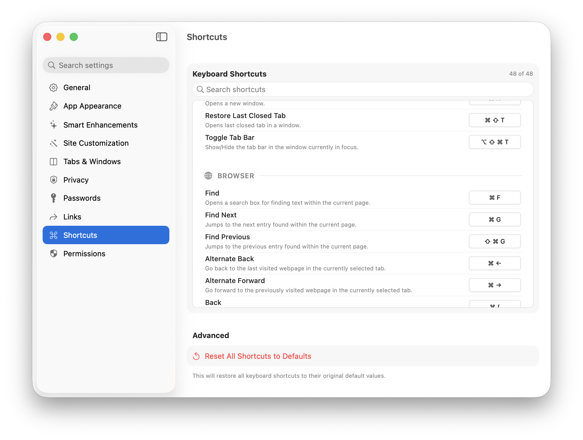 The default scope varies per action. For example, navigation shortcuts default to App, while Edit shortcuts (⌘C, ⌘V, etc.) default to Website.
